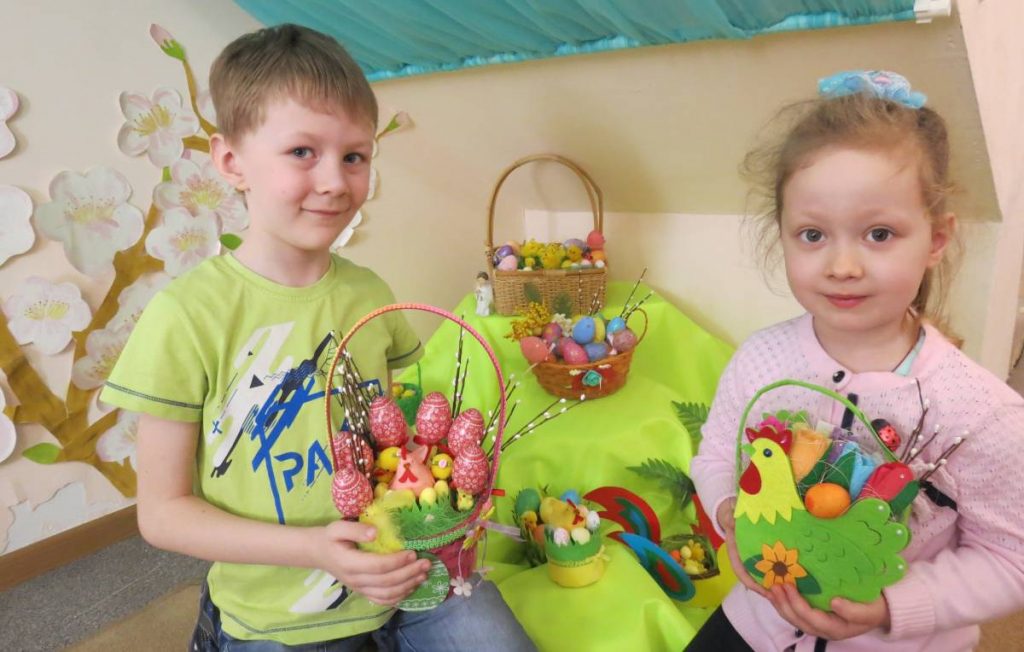 Воспитанники детского сада "Красная Шапочка" Трофим Синкевич и Виктория Малютина с поделками к Светлой Пасхе.