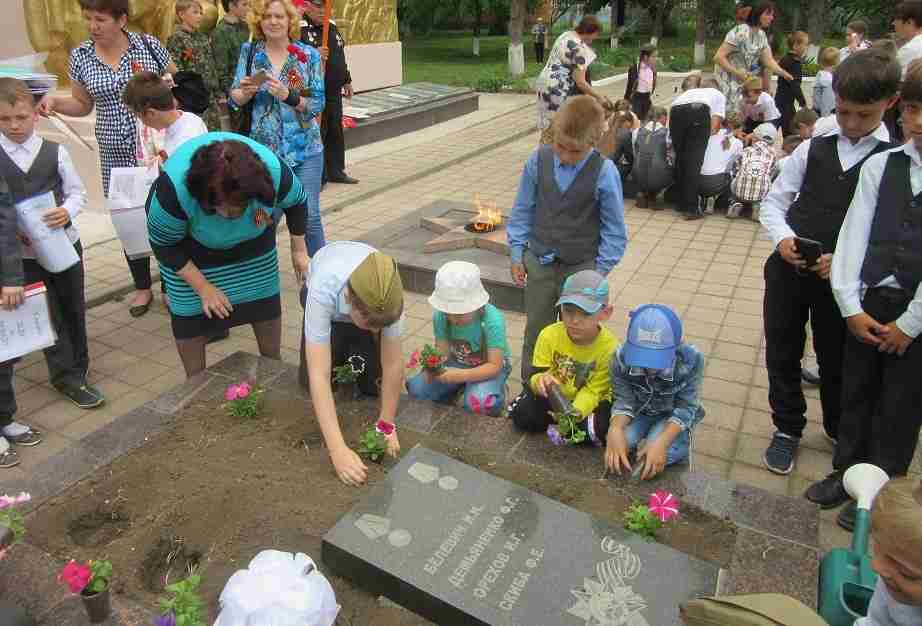 Детсадовцы вместе с учениками 4 класса школы № 5 посадили цветы на клумбу у станичной братской могилы, входящей в мемориальный комплекс погибшим в годы Великой Отечественной войны.