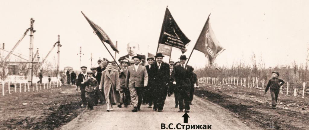 «Воспоминание о моём незабвенном однополчанине и лучшем друге Владимире Степановиче Стрижаке, бравом артиллеристе, Герое Советского Союза, кавалере многих орденов и медалей. Я служил вместе с Владимиром Степановичем в 1-й гвардейской пушечной артиллерийской бригаде с марта 1943-го по январь 1946 года. Наша бригада, а вместе с ней и мой друг, участвовала в Сталинградском сражении. Я тоже там воевал, но в другой части, и Владимира не знал. Познакомился с ним уже в мае 1943 года на боевых позициях в районном центре Тросна Курской области. Мы были командирами батарей (4 орудия 152-мм калибра), и наши наблюдательные пункты оказались на расстоянии 500 м друг от друга в первой траншее. Я с одним солдатом направился к нему на НП, чтобы от него получше рассмотреть вражеские цели, так как с моего наблюдательного пункта они были плохо видны. Так я познакомился с ним. Он сразу мне понравился. Улыбчивый парень, здоровяк, чисто выбрит, подтянут. В его землянке-блиндаже хоть и тесновато было, но опрятно. Угостил чаем меня. Поговорили о наших делах, потом подошли к стерео-трубе (оптический прибор в виде бинокля) и стали поочерёдно рассматривать расположение противника. Надо вам сказать, главная задача нас, артиллеристов, состояла в том, чтобы обнаруживать вражеские батареи, пулемёты, танки и другие цели, хорошо замаскированные, и потом, когда будет приказ, обрушивать на эти цели точный артиллерийский огонь.