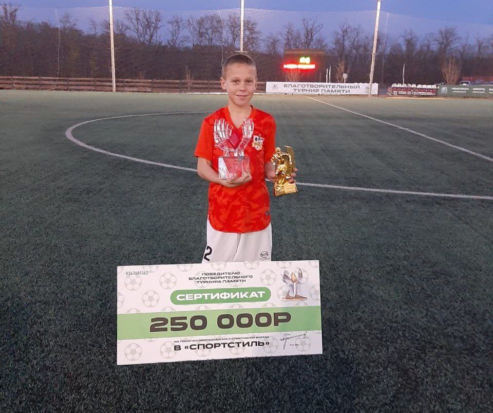 Ребятам вручили кубок и сертификат на покупку экипировки номиналом в 250 000 рублей. Лучшим защитником турнира признан игрок нашей команды Вячеслав Иванов. Лучшим игроком турнира признан Роман Алеников. Поздравляем футболистов и их тренера Евгения Лябина с победой!