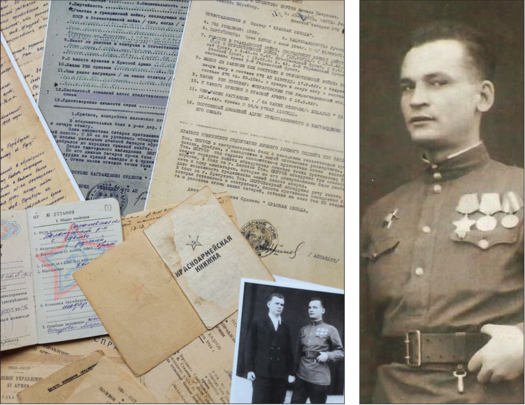 В нашей семье хранятся документы моего дедушки Шкурова Михаила Петровича: красноармейская книжка, военный билет, справки о ранении, справки об участии в определённых военных операциях и благодарность за них. Он ушёл на фронт 18-летним парнем, в 1942-ом году. С боями в составе 57 Армии 3-го Украинского фронта дошёл до Австрии, войну закончил в Вене. Он был храбрым и находчивым разведчиком 972 Артполка, удостоен ордена Красной Звезды, ордена Славы III степени, медалей «За отвагу», «За взятие Будапешта», «За освобождение Белграда», «За Победу над фашистской Германией в войне 1941-1945гг». Демобилизован в сентябре 1945 года как получивший три ранения.