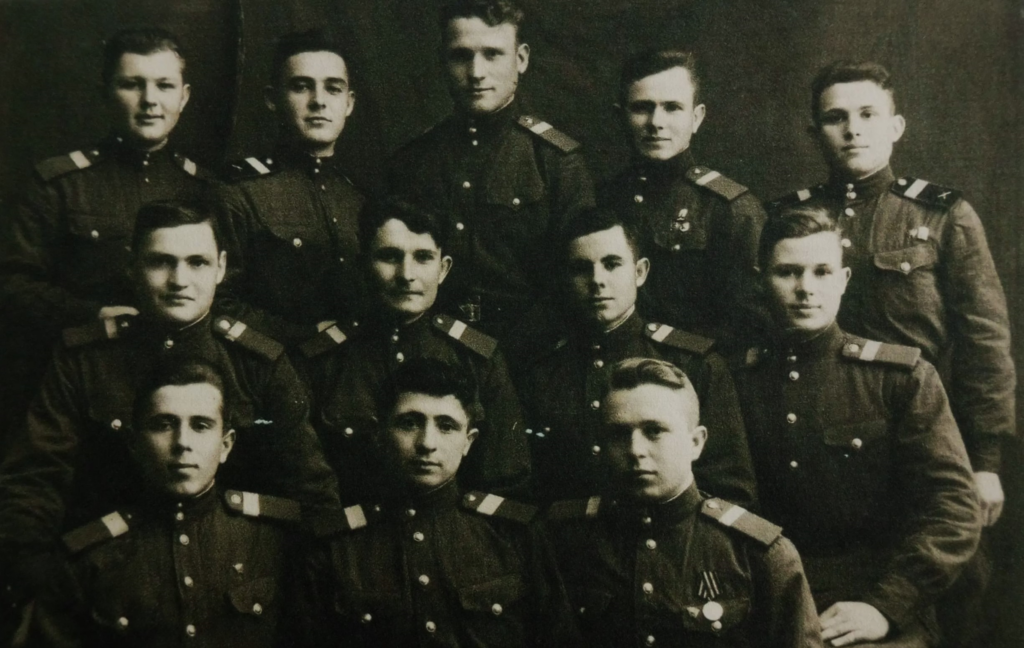 Здесь герой снимка рядовой. Курсанты также участвовали в учениях по химзащите, так как враг обладал запасами отравляющих веществ и мог их применить в любой момент, как во время Первой мировой войны. На такой случай бойцам выдавался противогаз, их обучали правилам пользования средствами химической защиты, дегазации местности и маскировке дымом. На одном из фото он на учениях по химзащите: пятеро в противогазах, а один без. Трудно определить, где на ней Иван.