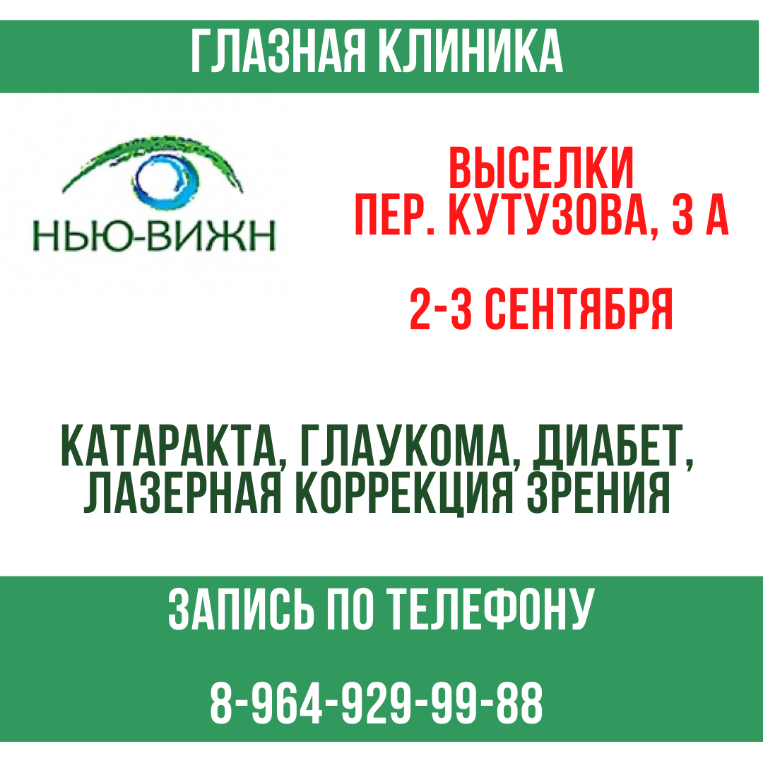 Комплексное обследование состояния здоровья глаз ведущими специалистами Краснодара в области офтальмохирургии с постановкой диагноза и назначением лечения. Бесплатный автобус в Краснодар на операцию и обратно. КАТАРАКТА, ГЛАУКОМА, ДИАБЕТ, ЛАЗЕРНАЯ КОРРЕКЦИЯ ЗРЕНИЯ. 2-3 сентября в ст. Выселки, пер. Кутузова, 3 А, Совет ветеранов. Запись по телефону.
