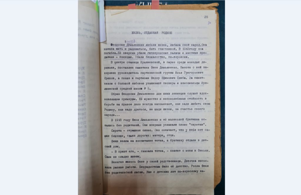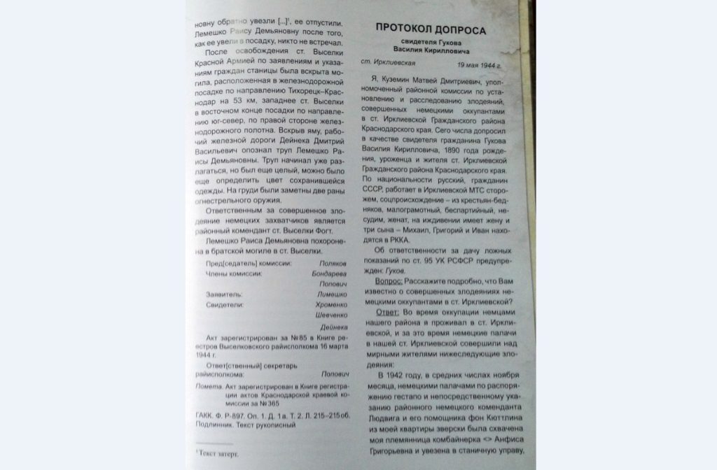 — В средних числах ноября из моей квартиры зверски была схвачена моя племянница, комбайнёрка Анфиса Григорьевна Демьяненко, и увезена в станичную управу, где над ней немецкие палачи тогда же начали зверски издеваться и устраивать ей невыносимые пытки, — рассказал на допросе уполномоченному районной комиссии по расследованию злодеяний, совершённых немецкими оккупантами, сторож Ирклиевской МТС Василий Кириллович Гуков. — Они ей ломали ноги и руки, а затем её расстреляли и выбросили её труп в школьный сарай.