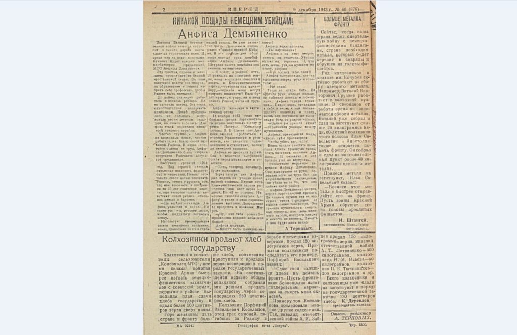 Девятого декабря 1943 года в № 60 газеты «Вперёд» Гражданского района была опубликована статья редактора А. Терновых «Анфиса Демьяненко» об ирклиевской партизанке. Какие новые сведения она открывает нам о девушке и какие вопросы ставит?