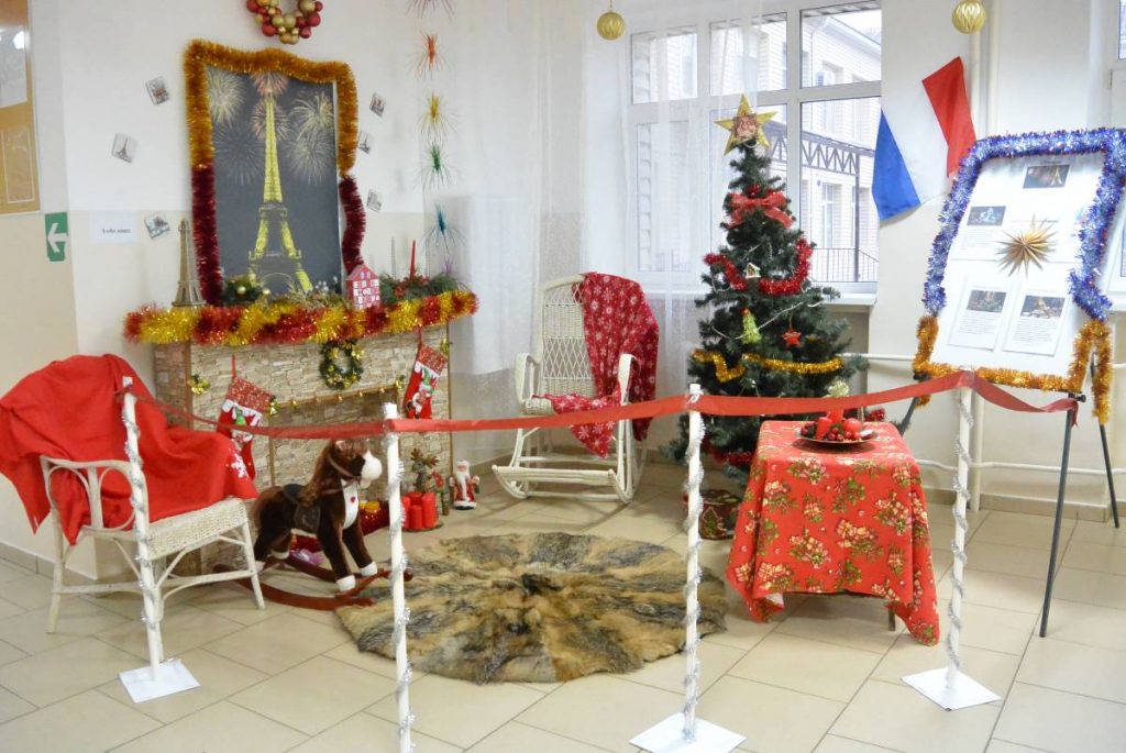 Необычный интерьер с элементами национальной атрибутики Франции оформили ученики 3 «А» класса. 31 декабря французы отмечают двойной праздник: встречать Новый год и отмечают день Святого Сильвестра. Они выходят на улицу в праздничных маскарадных костюмах, за что и получают прозвище Сильверстр-клаусов. А французский Дед Мороз, которого называют Пер Ноэлем приезжает на ослике с корзиной подарков, проникает в дом через камин и оставляет их в детских башмачках, оставленных у камина.