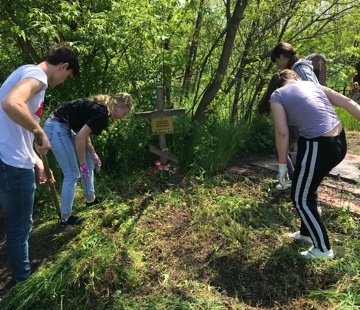 Ребята собрали старую листву и мусор, пропололи территорию около захоронений.