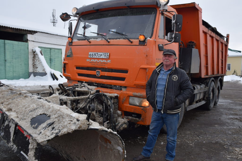 Ездит Александр Владимирович на КамАЗе с самосвальным прицепом. Зимой на кабину прикрепляют ковш, а на прицеп устанавливают специальный бункер, который обеспечивает автоматическую подачу песчано-солевой смеси на дорогу. Сидишь в кабине, тепло, уютно, а техника за тебя работает. А летом прицеп становится бортовым, Александр доставляет на объекты асфальт, песок, камень. Кроме того, выполняет ямочный ремонт, занимается содержанием дорог — установкой знаков, покосом травы вдоль