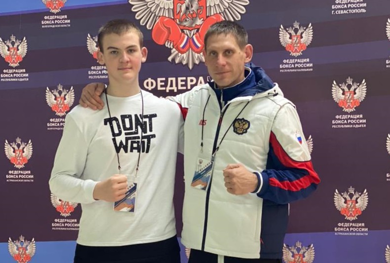 Серебряный призёр Первенства ЮФО по боксу среди юношей Денис Попов с тренером Андреем Назиным