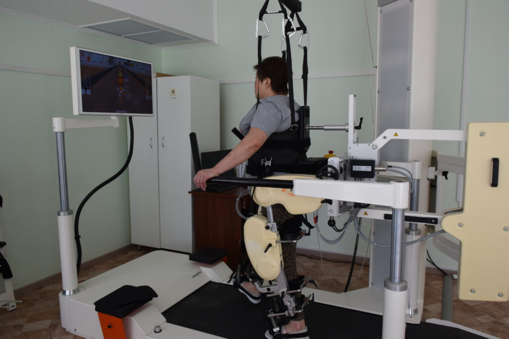 В зале также есть роботизированный комплекс для восстановления ходьбы — Локомат. Он предназначен для пациентов с неврологическими нарушениями, травмами головного и спинного мозга или после инсульта. Пациент фиксируется в подвесной системе над беговой дорожкой, а роботизированные ортезы имитируют естественные движения ног. Тренировки проходят в игровой форме. На экране монитора двигается аватар, и пациент может управлять траекторией и скоростью ходьбы. Это мотивирует пациента, так как он может собирать бонусы, например, монеты. Система измеряет усилия пациента и регулирует нагрузку. Эффективность Локомата подтверждена более чем 20-летними исследованиями. Регулярные занятия помогают восстановить двигательные функции и вернуться к самостоятельной ходьбе.