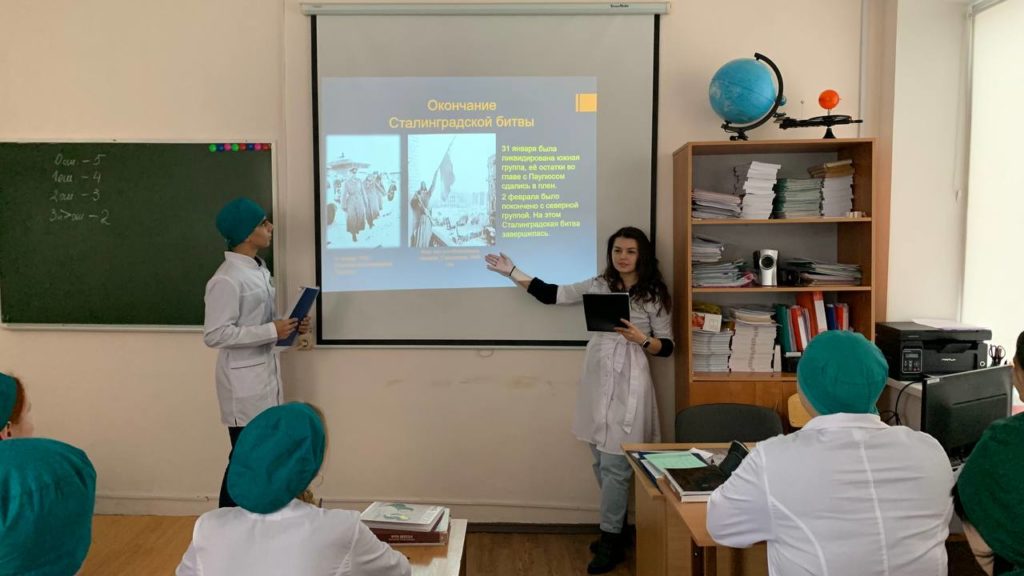 Так, волонтеры клуба «Добрые сердца» и студенты медицинского колледжа под руководством Т.М. Усмановой приняли участие в беседе «Сталинградская битва», посвящённой Дню разгрома советскими войсками немецко-фашистских войск в Сталинградской битве. Участники беседы узнали об основных военных операциях, связанных с этой исторической датой. Память погибших почтили минутой молчания.