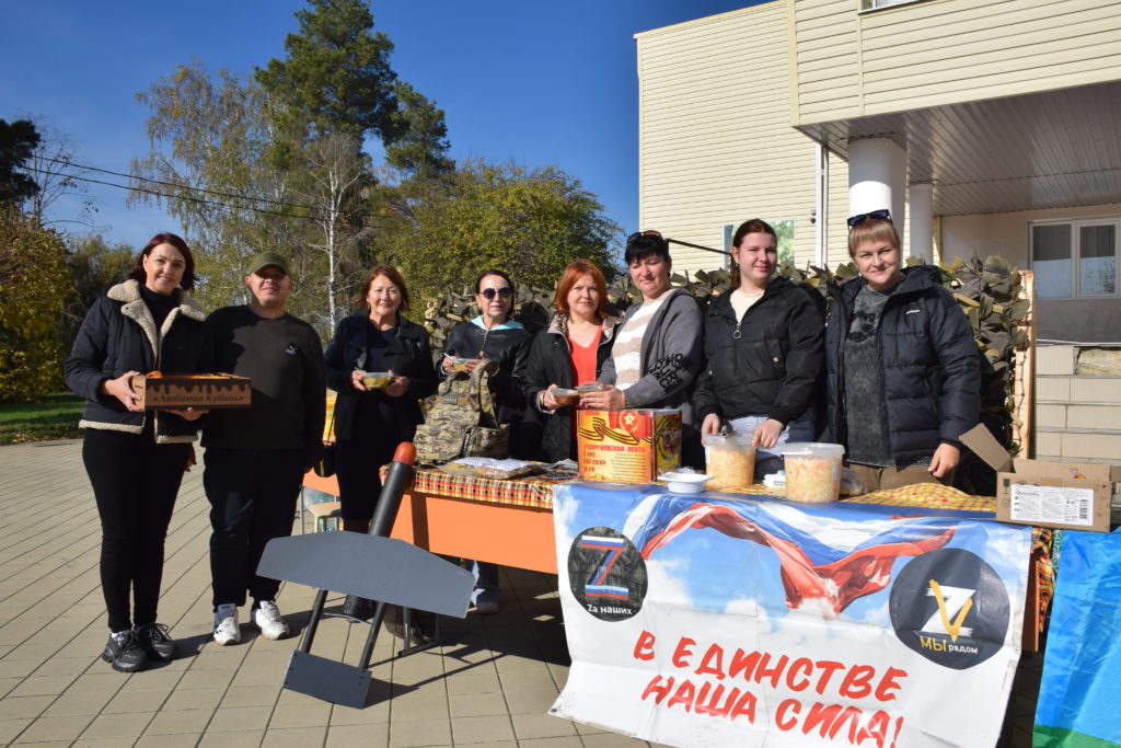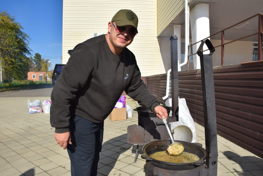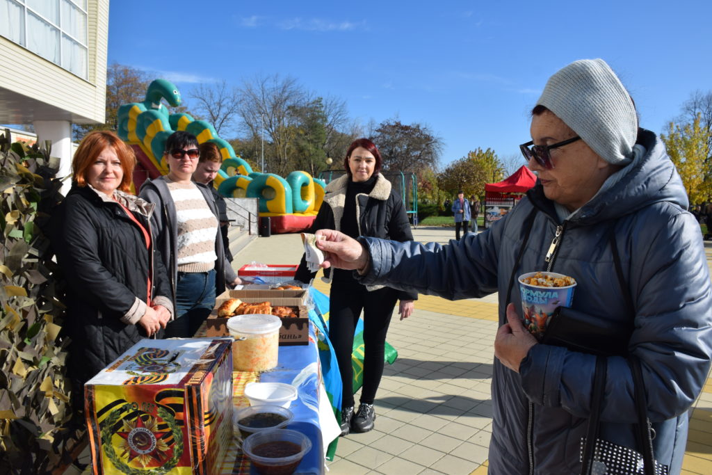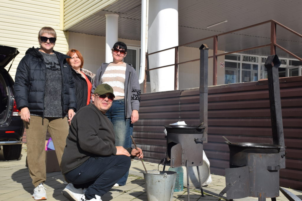 У сельского Дома культуры перед началом большого концерта дети играли на батутах, взрослые – поддерживали волонтеров. Инициативная группа организовала не только сбор средств для помощи фронту, но и угощения. Роман Романько, ветеран-десантник, мастерски справлялся с мобильными печами, варил супчик и борщ – из сухих смесей, которые наши хозяюшки изготавливают и передают на фронт. Его помощники на праздничной кухне – активные волонтёры групп «Мы рядом» и «Za наших». Девчонки успели напечь вкусных пирожков на ярмарку, установить трофеи с СВО. Приятно, что хуторяне поддержали земляков, они принесли закрутку, носки, лекарства для солдат СВО. Волонтёры собрали небольшие, но необходимые средства для активностей групп. Спасибо всем!