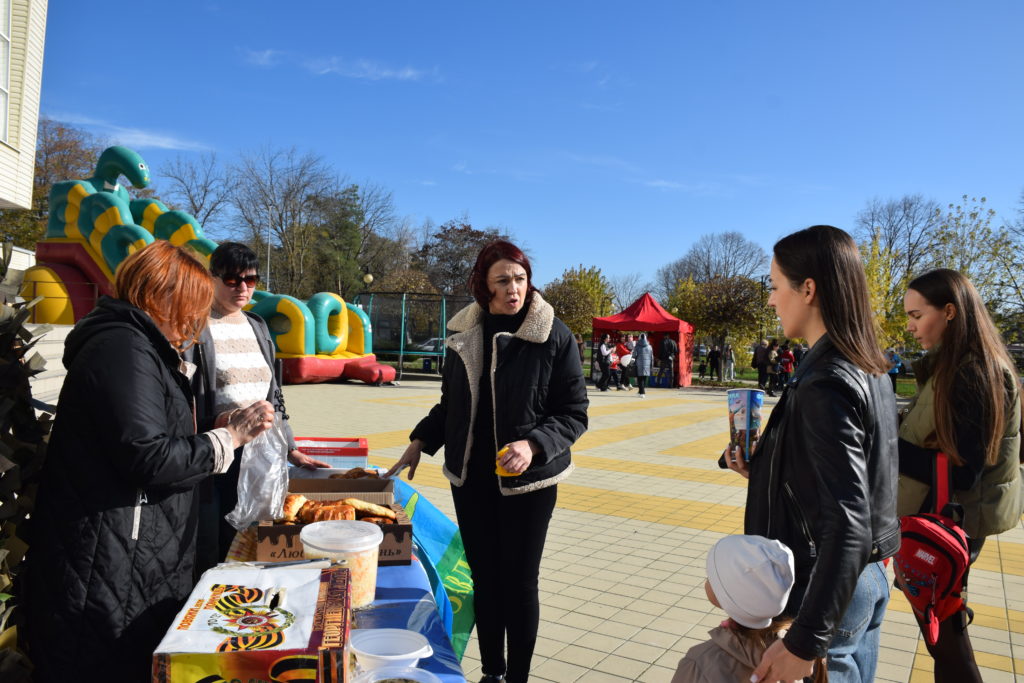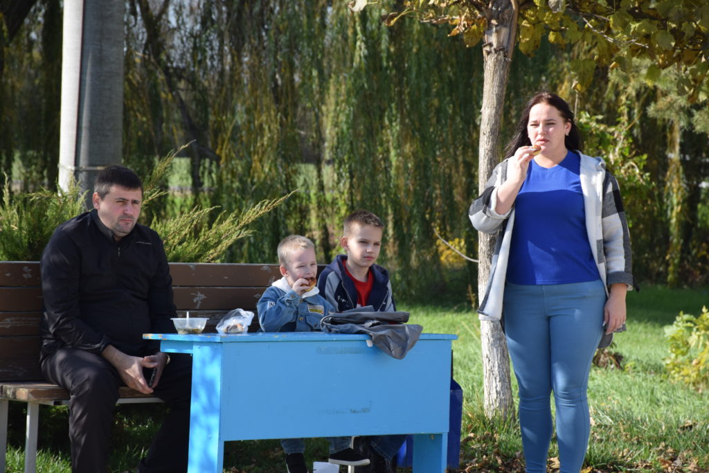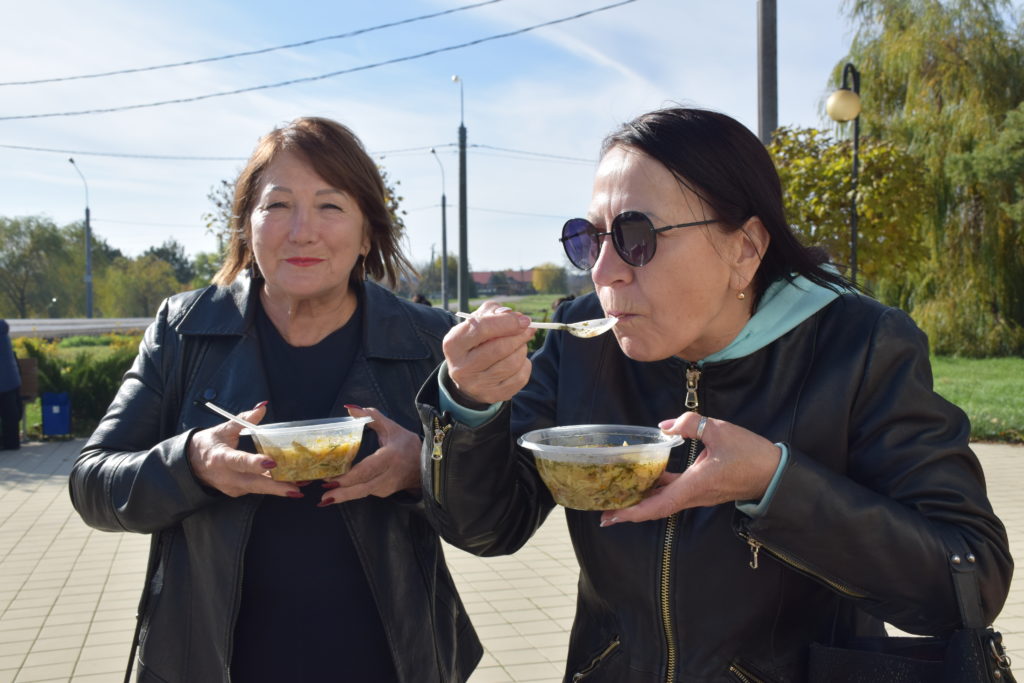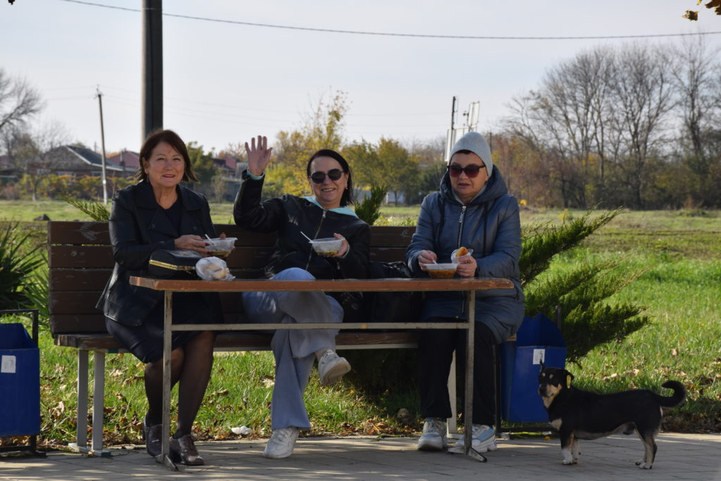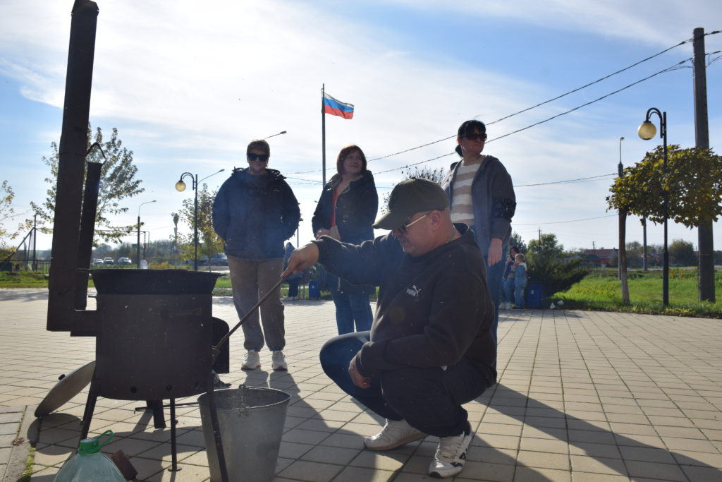 У сельского Дома культуры перед началом большого концерта дети играли на батутах, взрослые – поддерживали волонтеров. Инициативная группа организовала не только сбор средств для помощи фронту, но и угощения. Роман Романько, ветеран-десантник, мастерски справлялся с мобильными печами, варил супчик и борщ – из сухих смесей, которые наши хозяюшки изготавливают и передают на фронт. Его помощники на праздничной кухне – активные волонтёры групп «Мы рядом» и «Za наших». Девчонки успели напечь вкусных пирожков на ярмарку, установить трофеи с СВО. Приятно, что хуторяне поддержали земляков, они принесли закрутку, носки, лекарства для солдат СВО. Волонтёры собрали небольшие, но необходимые средства для активностей групп. Спасибо всем!